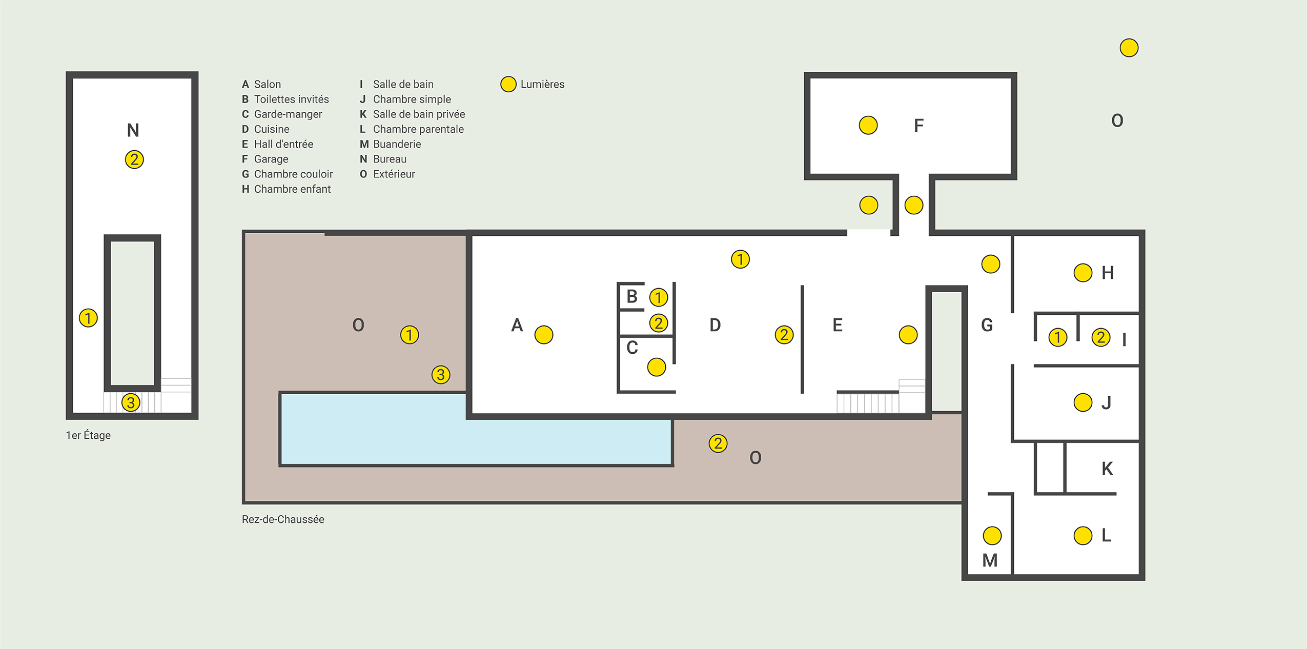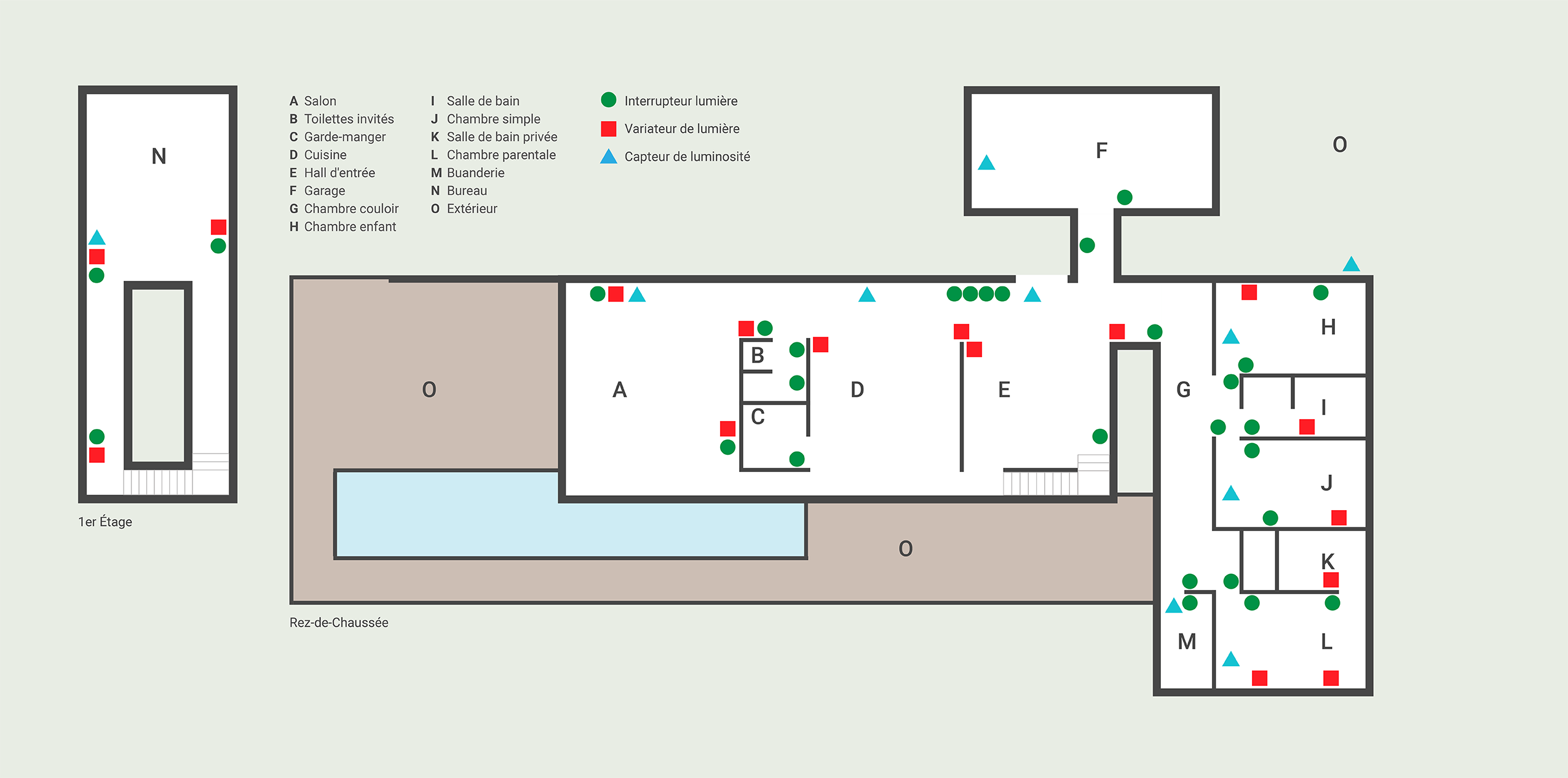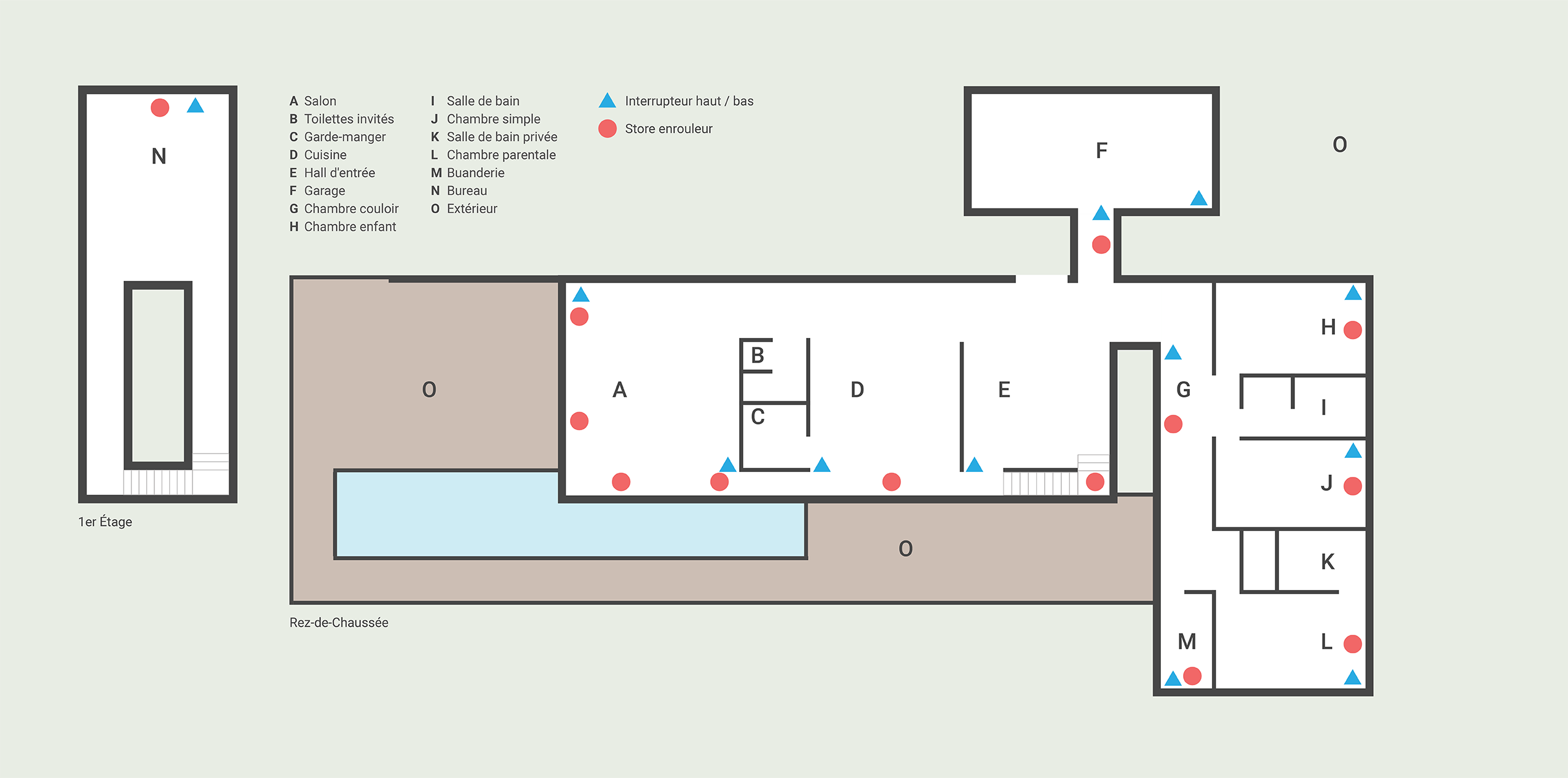 Carte des éléments¶ Carte des éléments Home I/O PDF Télécharger Les cartes suivantes indiquent les éléments disponibles et leur position. Lumières Lumières Interrupteur lumière Store enrouleur et interrupteur haut / bas Radiateur et Thermostat Détecteurs Autres