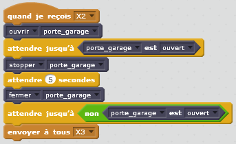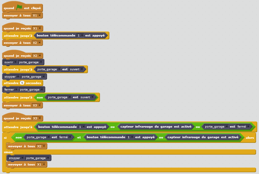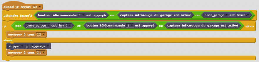 Dans ce script, dès la réception du message « X3 », il faut vérifier qu’au moins une des conditions de la divergence en OU est présente : « bouton télécommande 1 » OU « capteur infrarouge du garage » OU « porte du garage fermée ». Pour cela, on utilise un bloc « attendre jusqu’à » dans lequel on ajoute les l’état des capteurs correspondants.