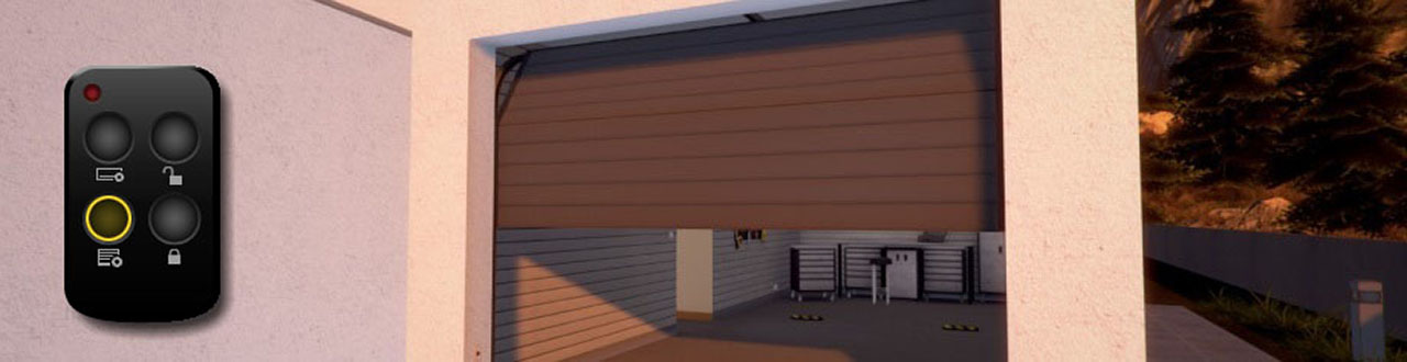 Porte de garage automatique avec son contrôleur intégré. En mode Câblé, la porte de garage se pilote avec la télécommande ou bien l’interrupteur à 2 positions (haut/bas) qui se trouve dans le garage.