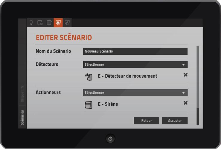 Un scénario est créé si et seulement si au moins un détecteur et une alarme ont été définis.