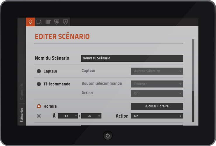 Affiche la liste des scénarios existants. Cliquez sur Ajouter Scénario pour créer un nouveau scénario concernant l’éclairage.