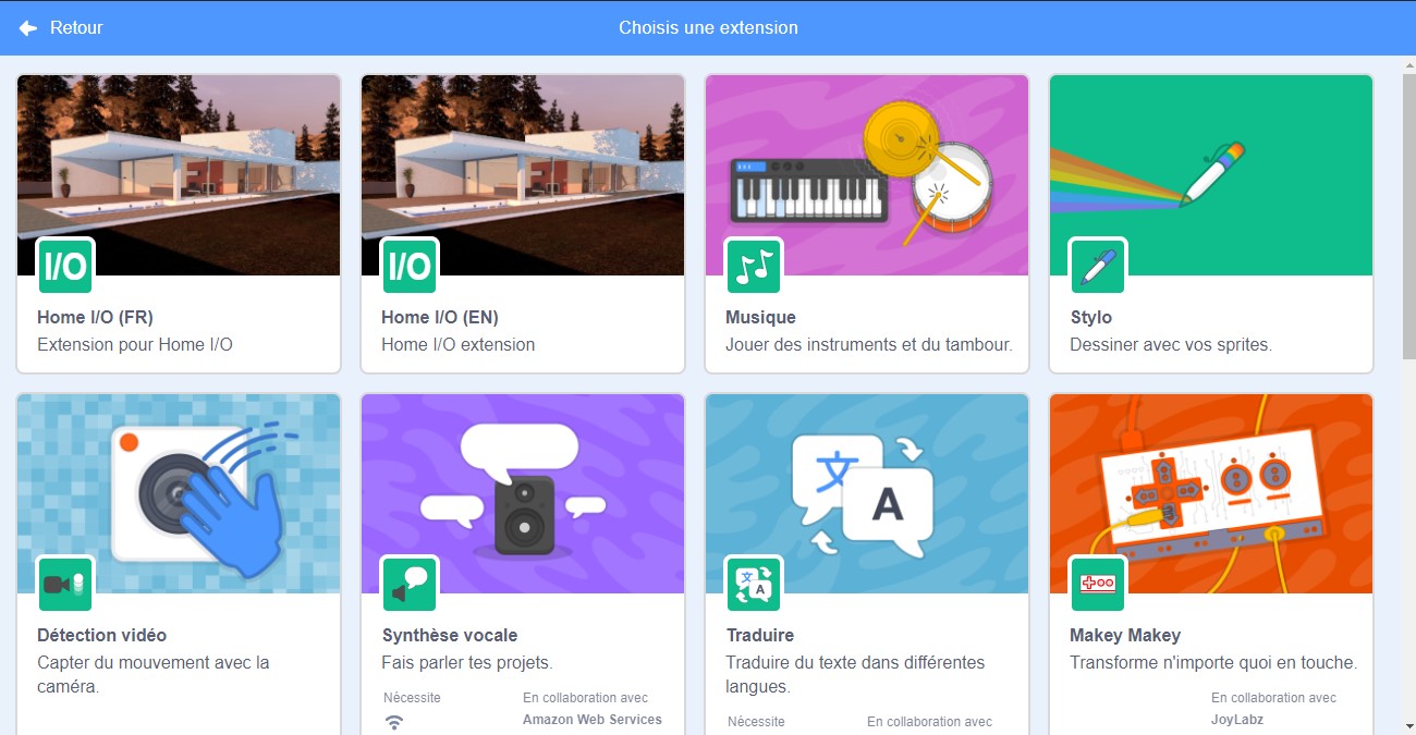 Extensions supplémentaires sont disponibles en plus des extensions de base proposées par Scratch 3 : Home I/O (FR) et Home I/O (EN). Ces 2 extensions permettent respectivement d’échanger avec la version française ou la version anglaise de Home I/O.